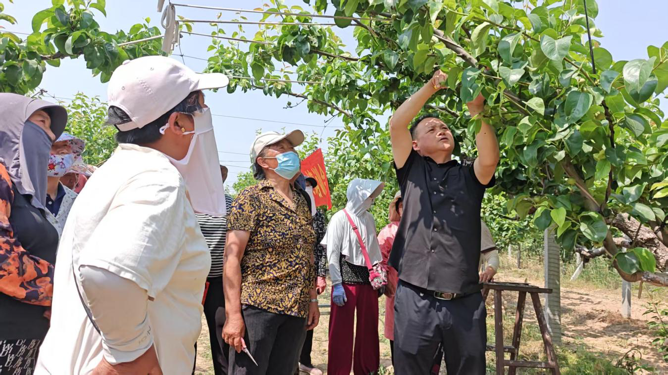 (市人大代表杜华给梨农讲解梨树疏果技术)